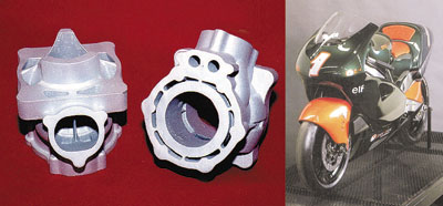 -- Using a rapid, patternless casting method, Soligen was able to cut the lead time to produce a racing engine for Buckley Systems’ GP 500cc motorcycle (r) by 40%, as well as increase its horsepower by 25%. -- In 1998, Buckley Systems, Ltd., a New Zealand Grand Prix motorcycle team, had an idea for increasing the horsepower and performance of their racing engine. The only problem was getting its newly designed engine block cast, machined and tested before the start of the next race. Traditionally, Buckley would go the route of conventional sand castings for its engine components. However, with time running out and the expense involved in making tooling for just a few castings, it was open to methods of rapid prototyping and manufacturing. Making conventional patterns and coreboxes to cast this complex engine barrel would take 5-6 weeks at best. It didn’t have that much time. The engine block casting it had designed required a complex core to form the water jacket and cylinder features. This manufacturing necessity narrowed the playing field of RP processes. After researching a number of different rapid prototyping methods that could convert the 3-D CAD data to a cast part, it chose Soligen, Inc., a company out of Northridge, California, that works with a rapid, patternless casting method called Direct Shell Production Casting. This process uses 3-D printing to make a ceramic mold complete with integral cores and gating directly from the CAD data. Buckley emailed Soligen the 3-D CAD data and received A356 T6 aluminum engine castings ready to assemble and functionally test in 18 business days, half the time of conventional methods. “The complexity of our design along with the need to meet a short lead time led us to this patternless casting method,” said Buckley Project Engineer Paul Tracey. “We were in crisis mode, and only this process could get us a race-ready part when we needed it.” The result for Buckley has been a 25% increase in horsepower, considerable savings in time and money, and avoiding pattern modifications for each revision. Original article appears at Engineered Casting Solutions |