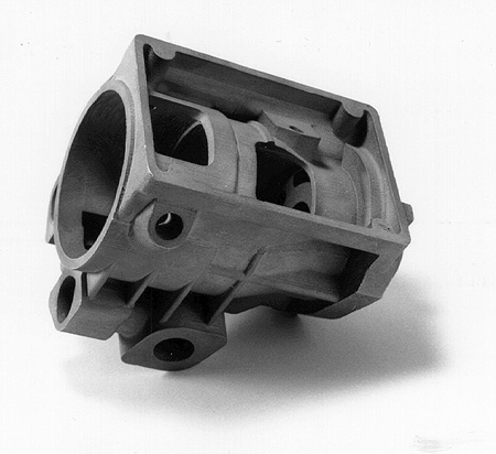 Fuel injector housing Program: 4-8 DSPC prototype castings for testing Approximate part size: 7" x 5" x 6" Material: 356-T6 aluminum Delivered: 10 business days Special challenges: Multiple complex cores.